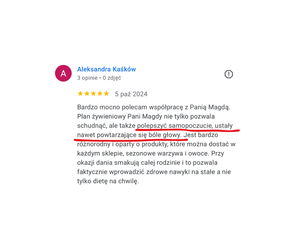 Co się zmieniło: „To pierwsza współpraca, w której zajęłyśmy się moją głową, a nie tylko talerzem. Zrozumiałam, jakie emocje mną kierują i nauczyłam się je obsługiwać bez czekolady. Waga spada, ale to wolność od ciągłych myśli o jedzeniu jest bezcenna. Czuję się zaopiekowana i zrozumiana.”